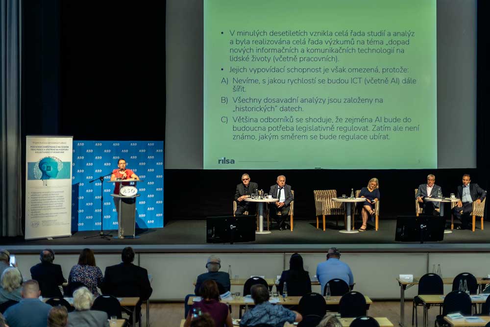 Závěr odborné části konference patřil prezentaci odborné studie „Sociální dialog v procesu adaptace na změny způsobené využíváním nových technologií a umělé inteligence v pracovním prostředí“, s níž vystoupili Soňa Veverková a Renáta Kyzlinková z Výzkumného institutu práce a sociálních věcí.