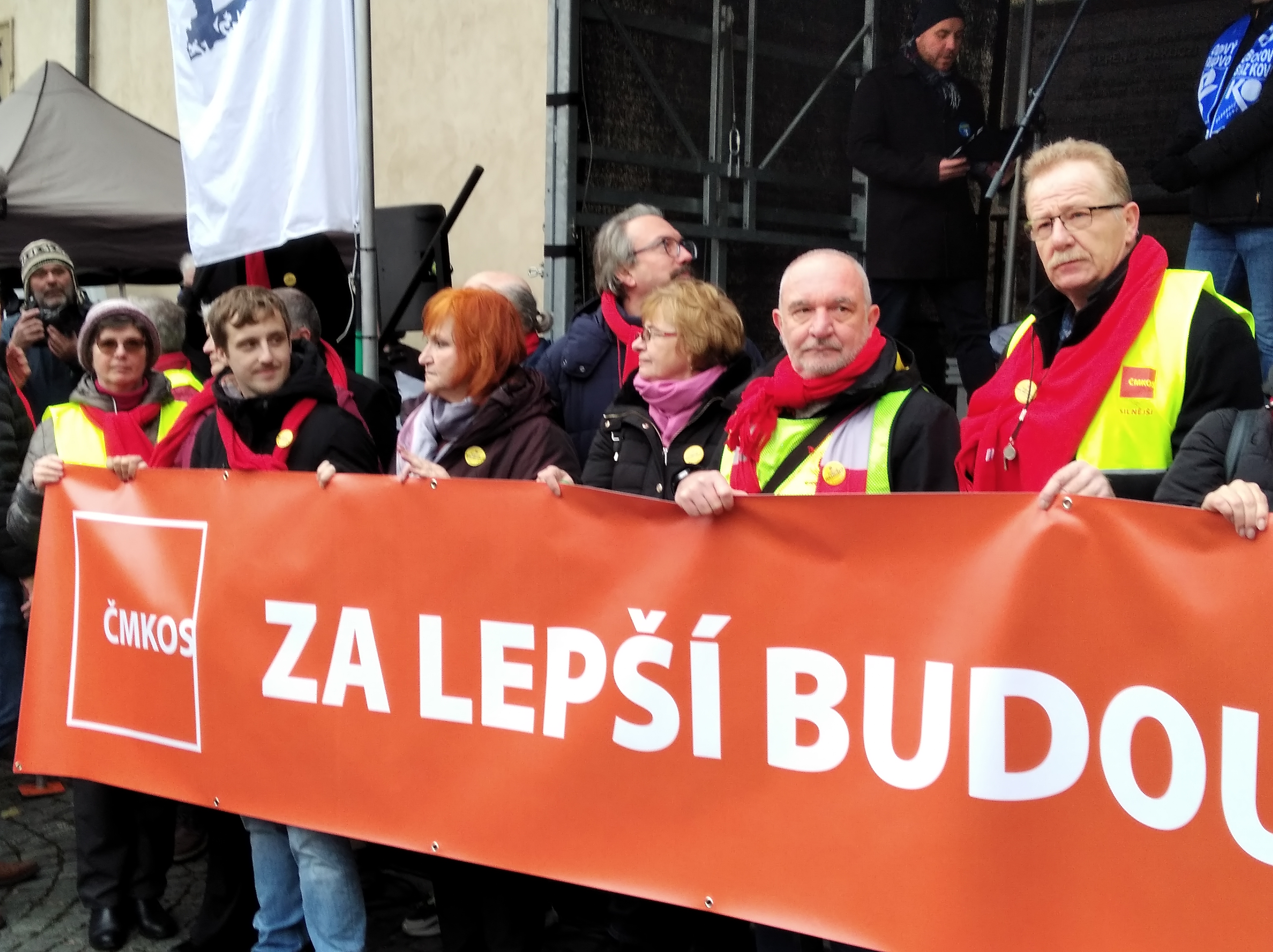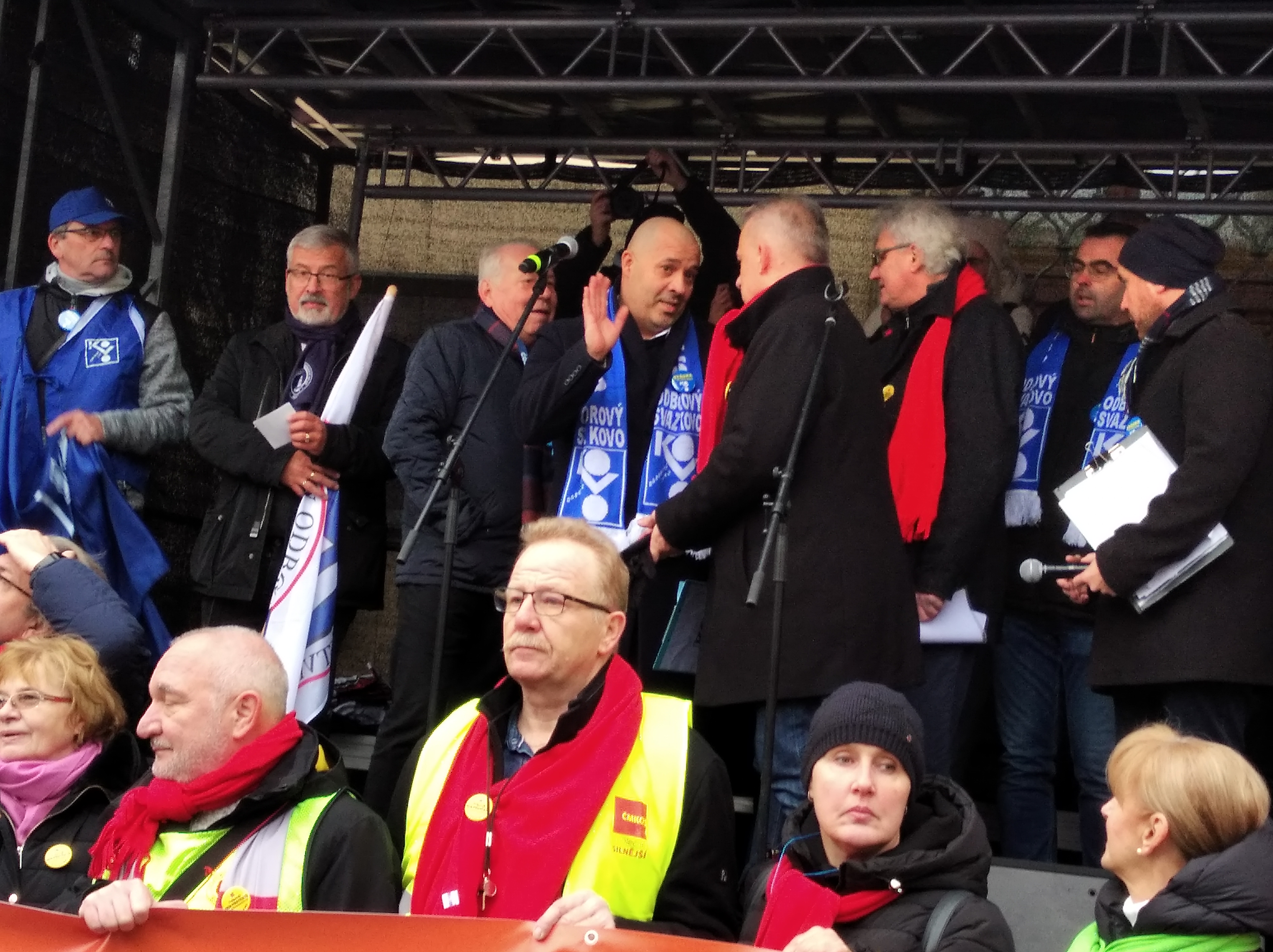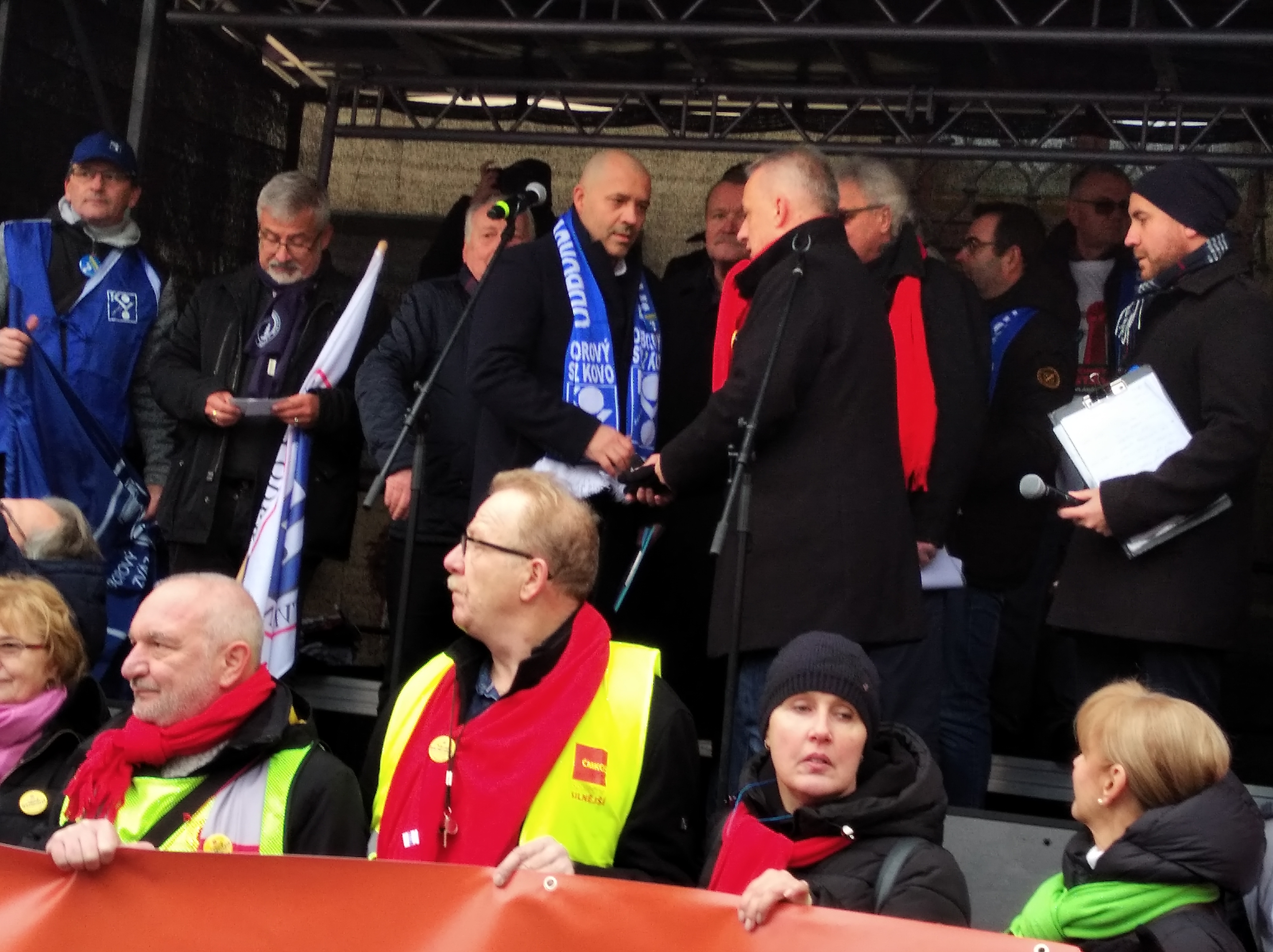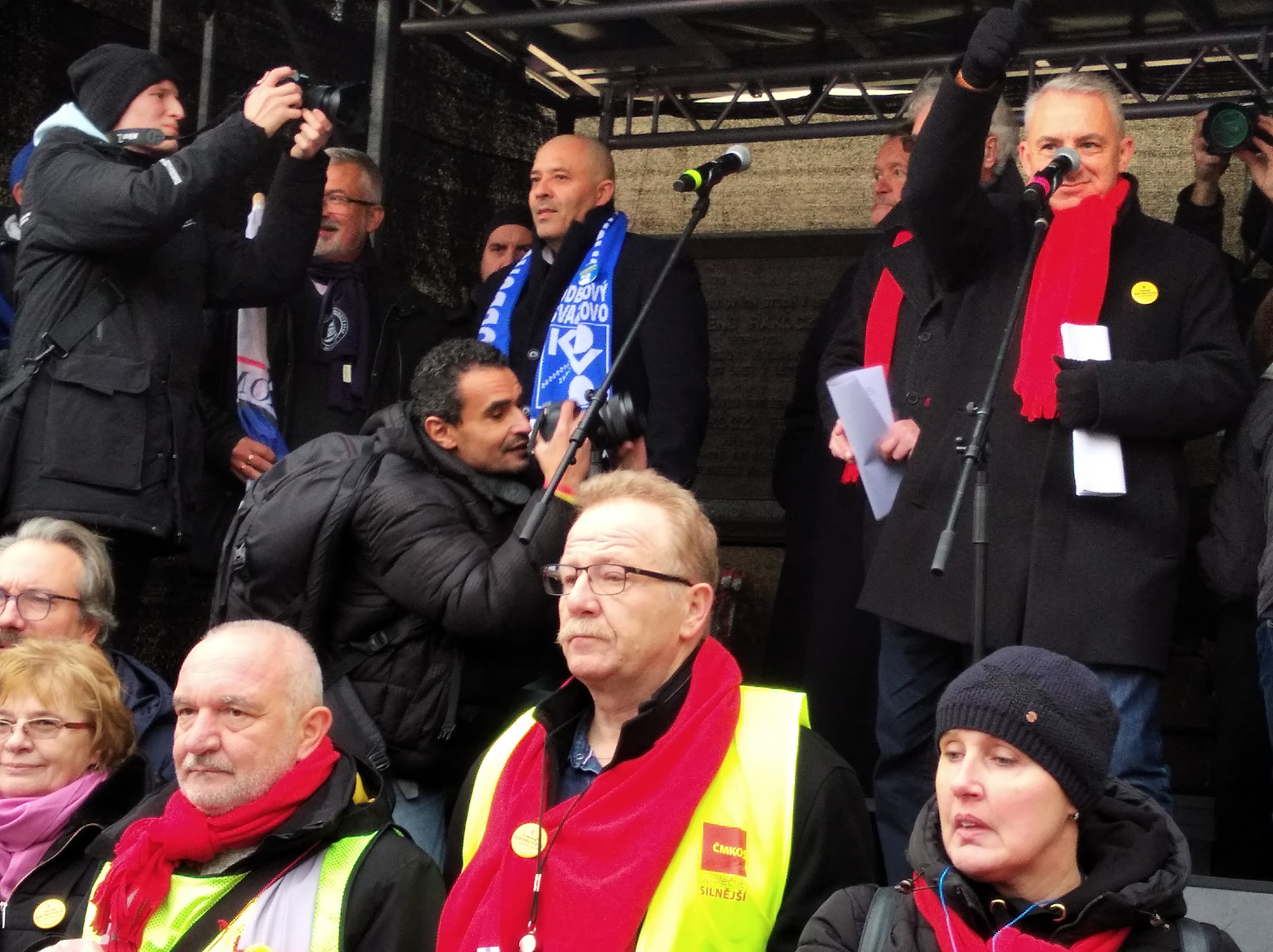 Předsedy Českomoravské konfederace odborových svazů (ČMKOS) Josef Středula, jenž z pódia tribuny promluvil jako první, v úvodu svého vystoupení, za sebe i ostatní předsedy odborových svazů na pódiu, poděkoval přítomným demonstrujícím odborářům s tím, že v poslední době se setkal se spoustou otázek ze strany vládní koalice, na které musí reagovat. Proto se také přítomných demonstrantů zeptal: „Myslíte si, že nevíte, proč tady jste?“ Odpovědí mu byl hluk a hukot demonstrantů, kteří tato dali najevo, že naprosto přesně vědí, proč demonstrují. Druhá otázka: „Myslíte si, že jedním z důvodů, proč tady jsme, že ním dramaticky, i díky vládě, klesla životní úroveň?“ Odpovědí byl opět hukot demonstrujících, kteří takto vyjádřili souhlas tím, že lidem u nás opravdu klesla životní úroveň. Poté následovaly další otázky: Myslíte si, že musí pan premiér jezdit do Německa zjišťovat ceny, místo, aby se zeptal nás?“ „Jste spokojeni s návrhem, aby se prodlužovat věk odchodu do důchodu?“ „Jste spokojeni s tím, že vláda nepředložila návrh na to, aby lidé, kteří pracují v těžkých profesích, šli do důchodu dříve?“ „Myslíte si, že vláda České republiky ví, jakým způsobem se normálním lidem žije?“ Na všechny tyto otázky následovat souhlasný pískot a hukot demonstrujících odborářů, kteří tak hlasitě dali najevo, co si o politice současné vlády myslí.